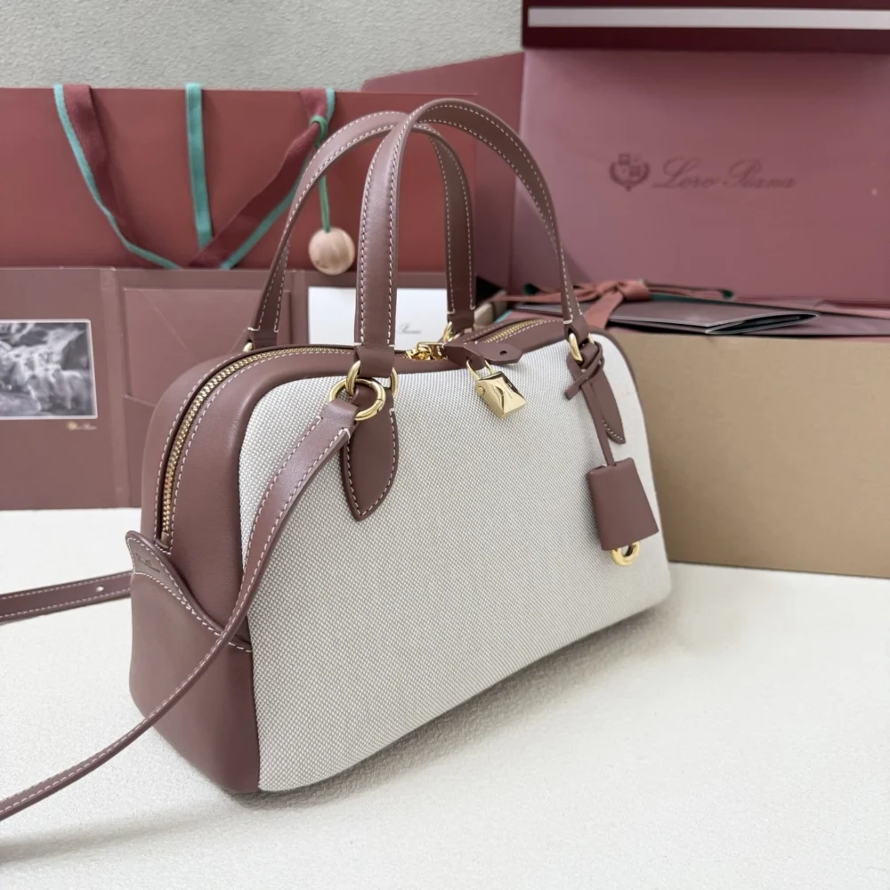 Here presented in a medium size, the Needle is a Loro Piana interpretation of the bowling bag, complete with the iconic LP charms. Evoking the Maison’s textile heritage, it is inspired by the bags used to carry knitting needles. It is constructed with soft, sinuous lines, allowing for versatile wear over the shoulder or in hand. Crafted from cotton and linen canvas with a velvety suede lining, it has a harmonious silhouette and is made with a single piece of leather along the sides.