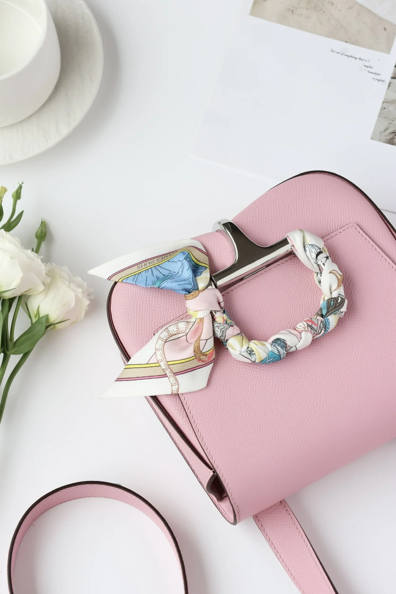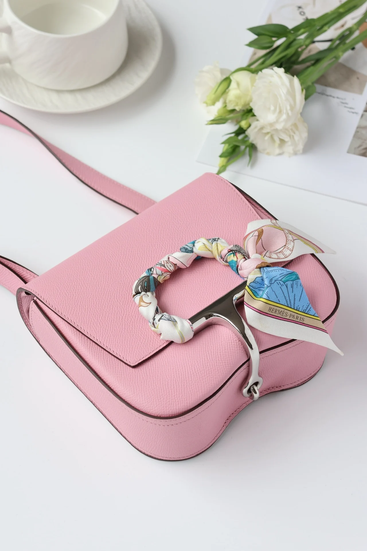 Della Cavalleria is a 17th century horse riding manual preserved at the Émile Hermès Museum, which has previously given its name to a silk scarf, and now refers to a truly innovative women’s bag. Embracing the silhouette of a half bit, its jewel clasp closes the flap and shapes the curves of the bag, evoking the contour of Hermès saddles. The metal hasp on the bottom attaches the clasp to the minimalist mechanism for easy and subtle opening and closing. Thanks to an adjustable strap, the mini version of the bag can be worn on the shoulder or across the body.