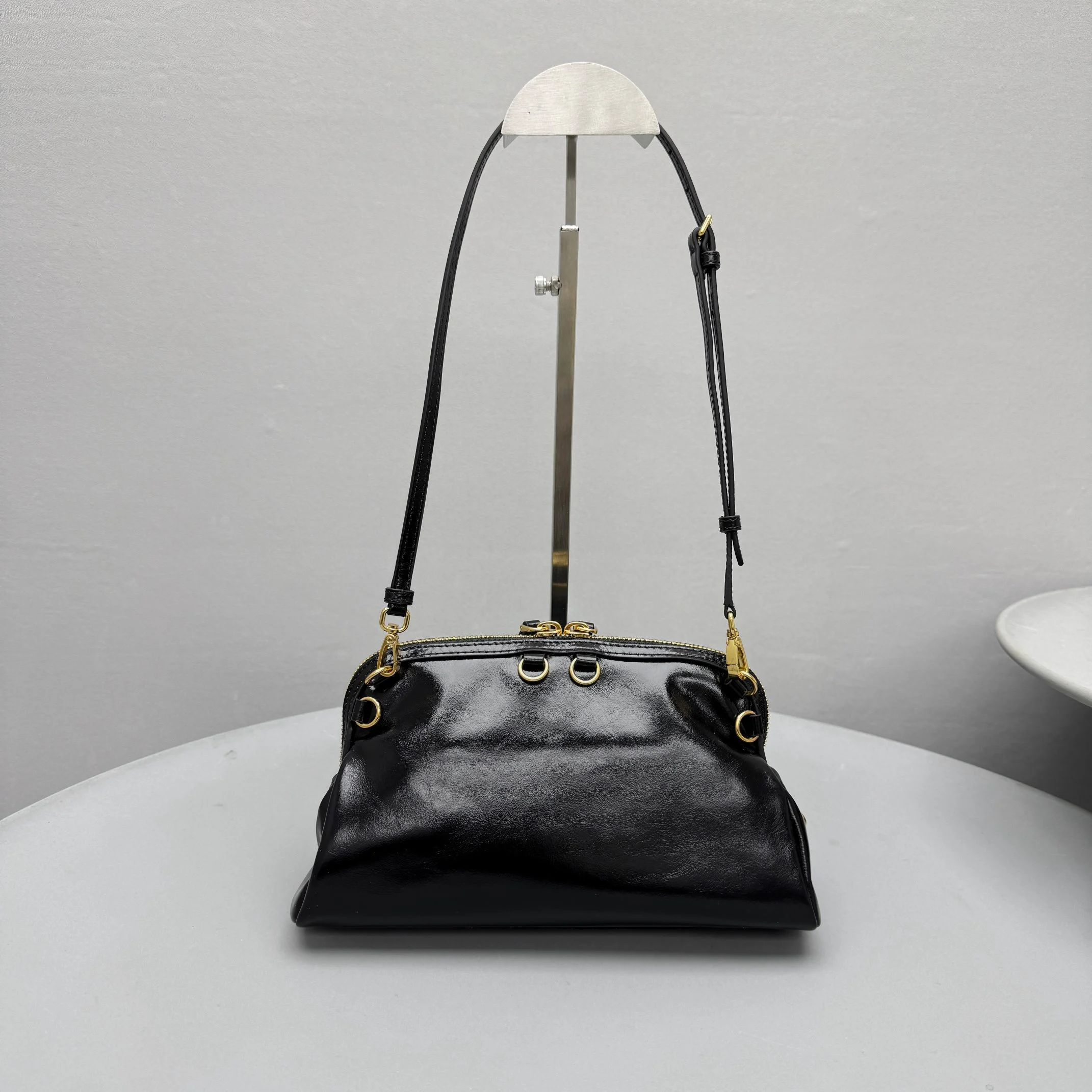• Versatility: The bag includes two removable, sliding leather shoulder straps. These allow it to be worn as a shoulder bag, crossbody, or carried as a clutch.
